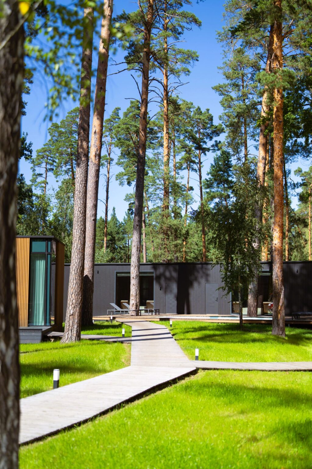 • Наші стильні двокімнатні котеджі вміщують до чотирьох осіб і оформлені з використанням екологічно чистих матеріалів, підтримуючи українських виробників. Тут ви знайдете затишок і комфорт, а великі панорамні вікна відкривають чудові види на навколишній ліс.